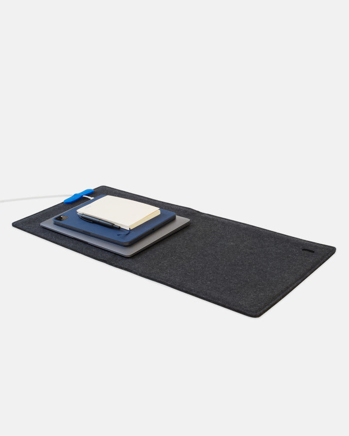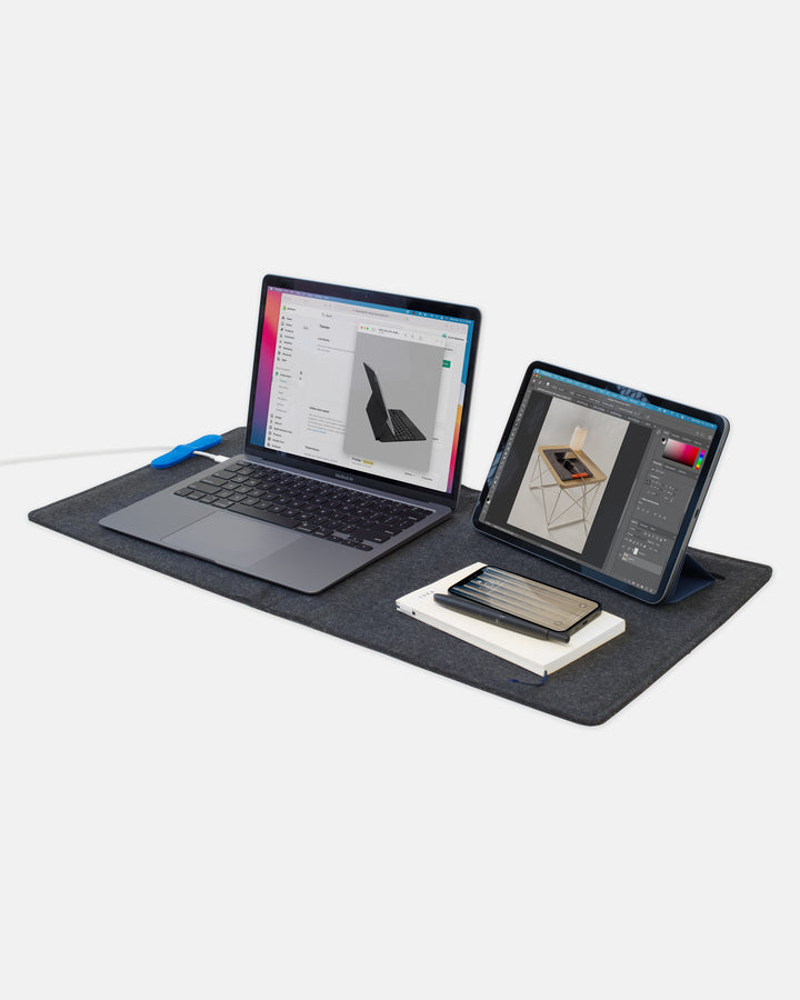 The Magic Sleeve Duo is 28.75 x 12.75" unfolded. It has been designed to hold a medium laptop (like a 13" or 14" MacBook Pro) and small or medium tablet (like as 11" or 12.9" iPad). Work with your devices side by side with universal control. Or use the extra wide space as a space for a mouse or trackpad. Magnet a cable keeper to your sleeve's perimeter to keep your cables organized and prevent them from slipping off your desk pad when your devices are not present. Note 15/16" laptops don't fit in the Duo.